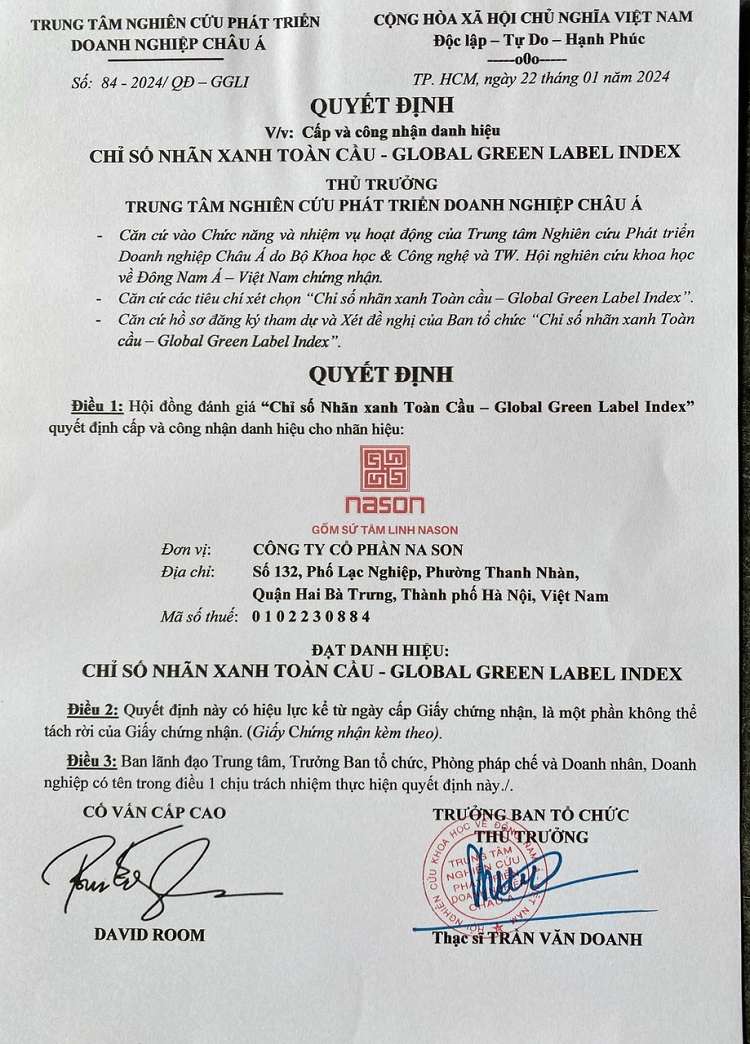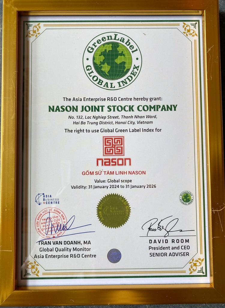 Công ty cổ phần gốm sứ Nason vinh dự đạt được chứng nhận “chỉ số nhãn xanh toàn cầu 2024” Do Trung tâm Nghiên cứu phát triển Doanh nghiệp Châu Á phối hợp với CLB Doanh nhân thế giới và các tổ chức Quốc tế uy tín trên toàn cầu, các chuyên gia kinh tế - tài chính – thương hiệu – Marketing danh tiếng, uy tín trên thị trường quốc tế đánh giá, xét chọn dựa trên các tiêu chuẩn toàn cầu đối với doanh nghiệp có thương hiệu uy tín, đầu ngành, có sản phẩm chất lượng cao được sản xuất, kinh doanh và đang lưu hành trên toàn thế giới.